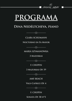 Esta semana queremos invitarles al recital de piano de Dina Nédeltcheva en la Sala Shigeru Kawai Center. Tendrá lugar el jueves 26 de marzo a las 19:30 h. Interpretará obras de Clara Schumann, María Szymanowka, Amy Beach y F. Chopin. Contamos con su presencia, ya saben que la entrada es gratuita hasta completar aforo. Les recordamos la dirección:  Plaza Francisco Morano, 3 – 28005- Madrid. Esperamos lo disfruten. Saludos.