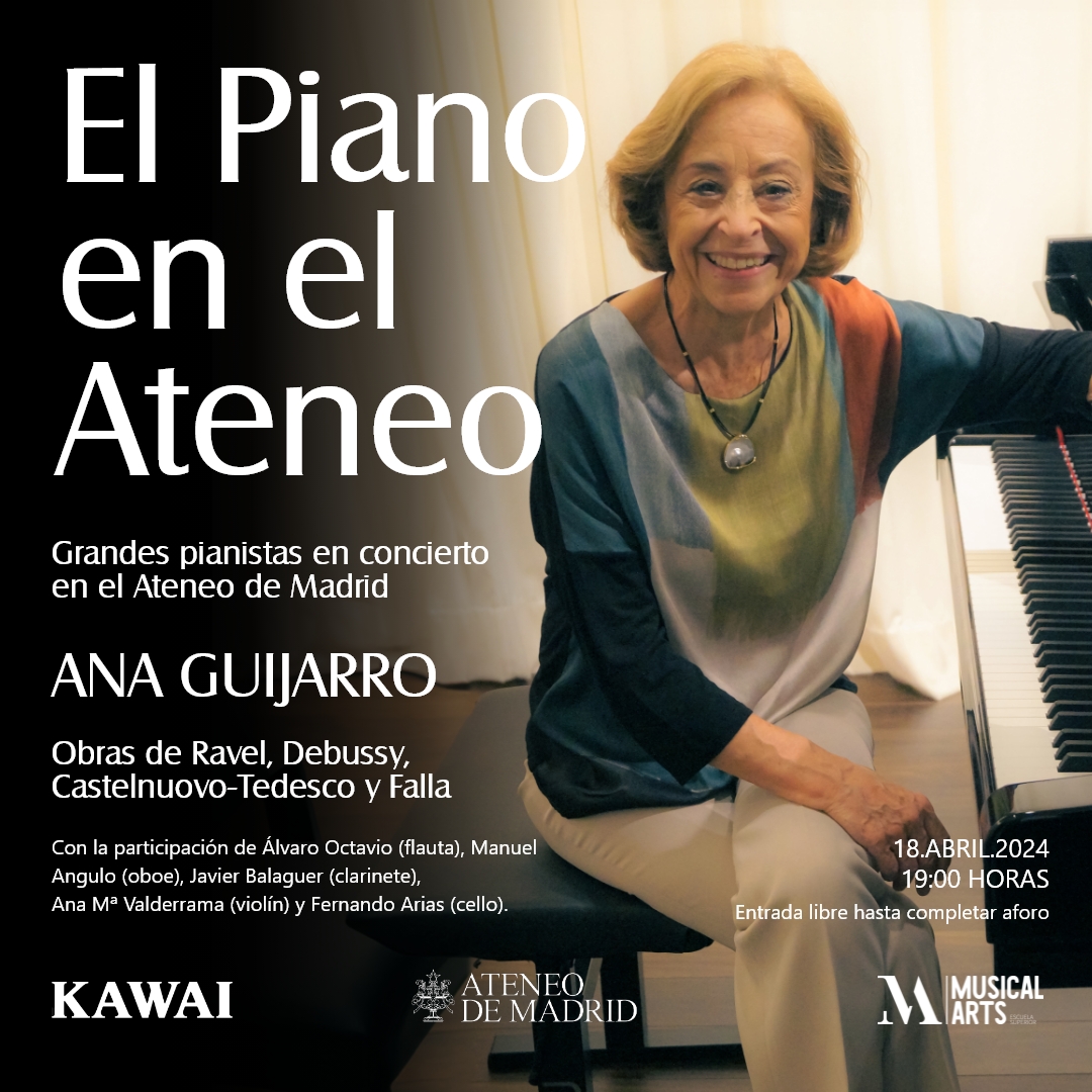 Este jueves 18  de abril a las 19 h. tendremos concierto en el Ateneo de Madrid con la reconocida y querida pianista Ana Guijarro. Nos deleitará con obras de Ravel, Debussy, Castelnuevo-Tedesco y Falla. Será inolvidable. Queremos invitarles a disfrutar de este recital en el que la entrada es gratuita hasta completar aforo. Nos vemos en la c/ del Prado, 21 – Madrid.